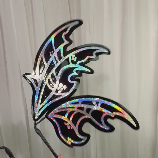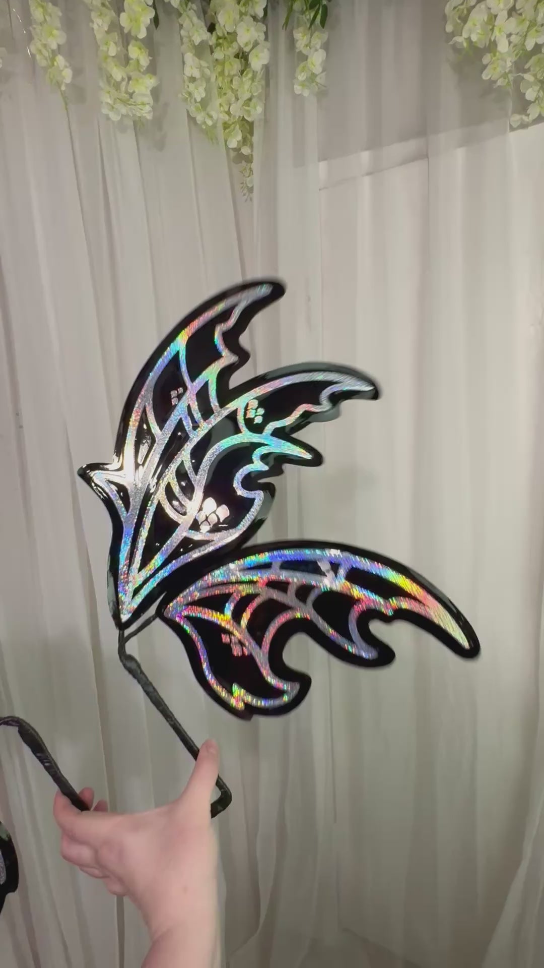 These wings are featured in black vinyl and accented with a glitter holographic veining overlays. The internal veining is a unique hybrid of cut plastic and wire for a light weight elegant look!