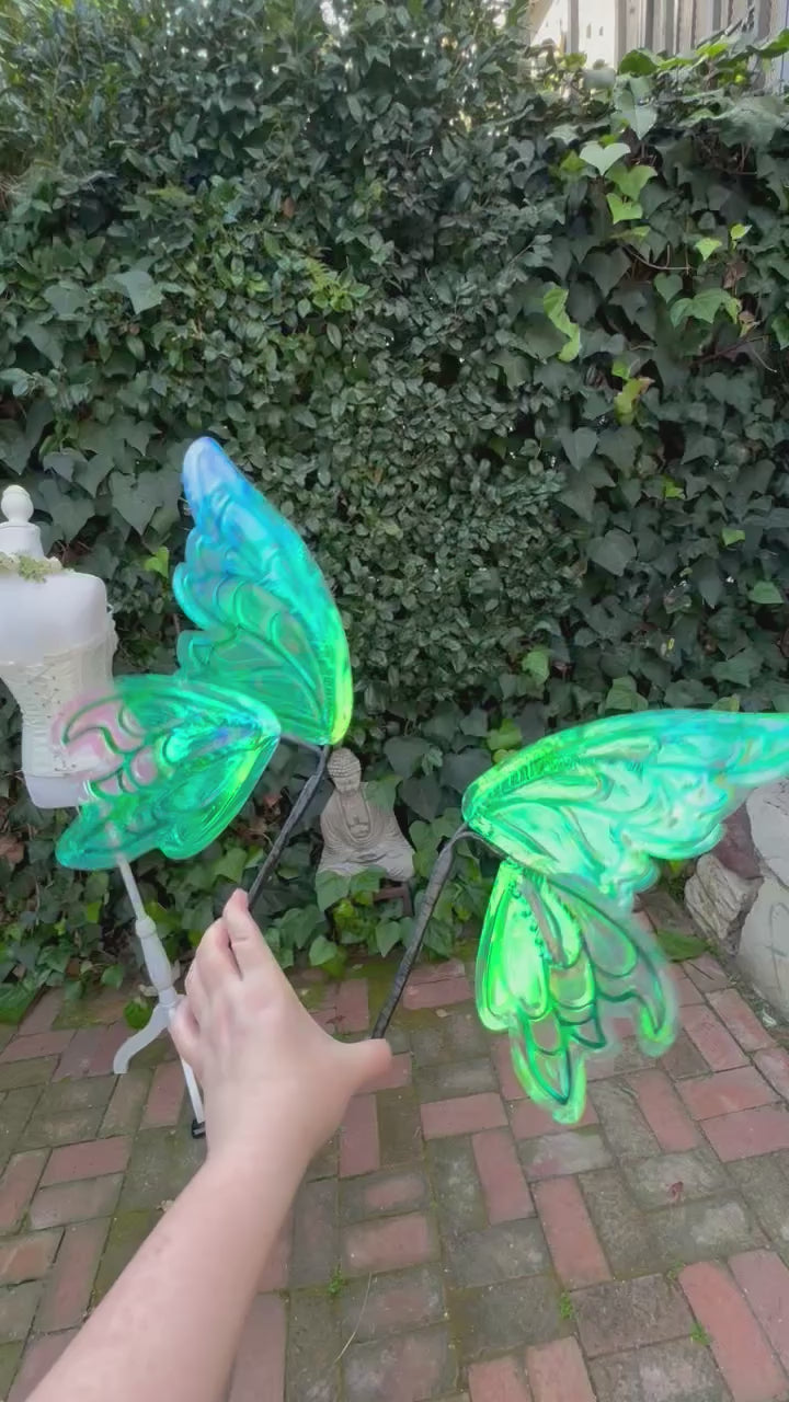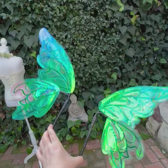 These wings are featured in opal iridescence, which shifts from green, to pink, to yellow, to a pearly clear depending on the light. The veining is a unique hybrid of cut plastic and wire for a light weight elegant look!