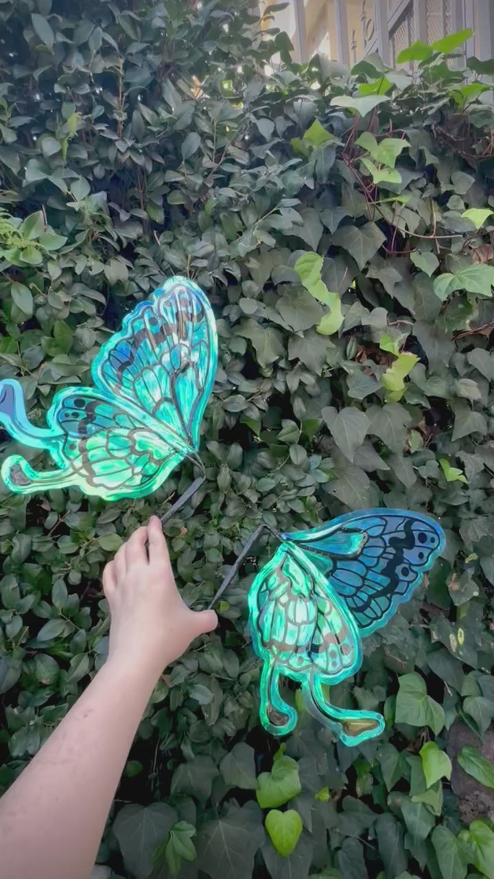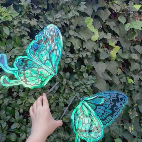 These wings are featured in arctic blue vinyl, which shifts from light blue, to purple, to a tealish green depending on the light. The wings were then overlaid with a black veining pattern. The internal veining is a unique hybrid of cut plastic and wire for a light weight elegant look!